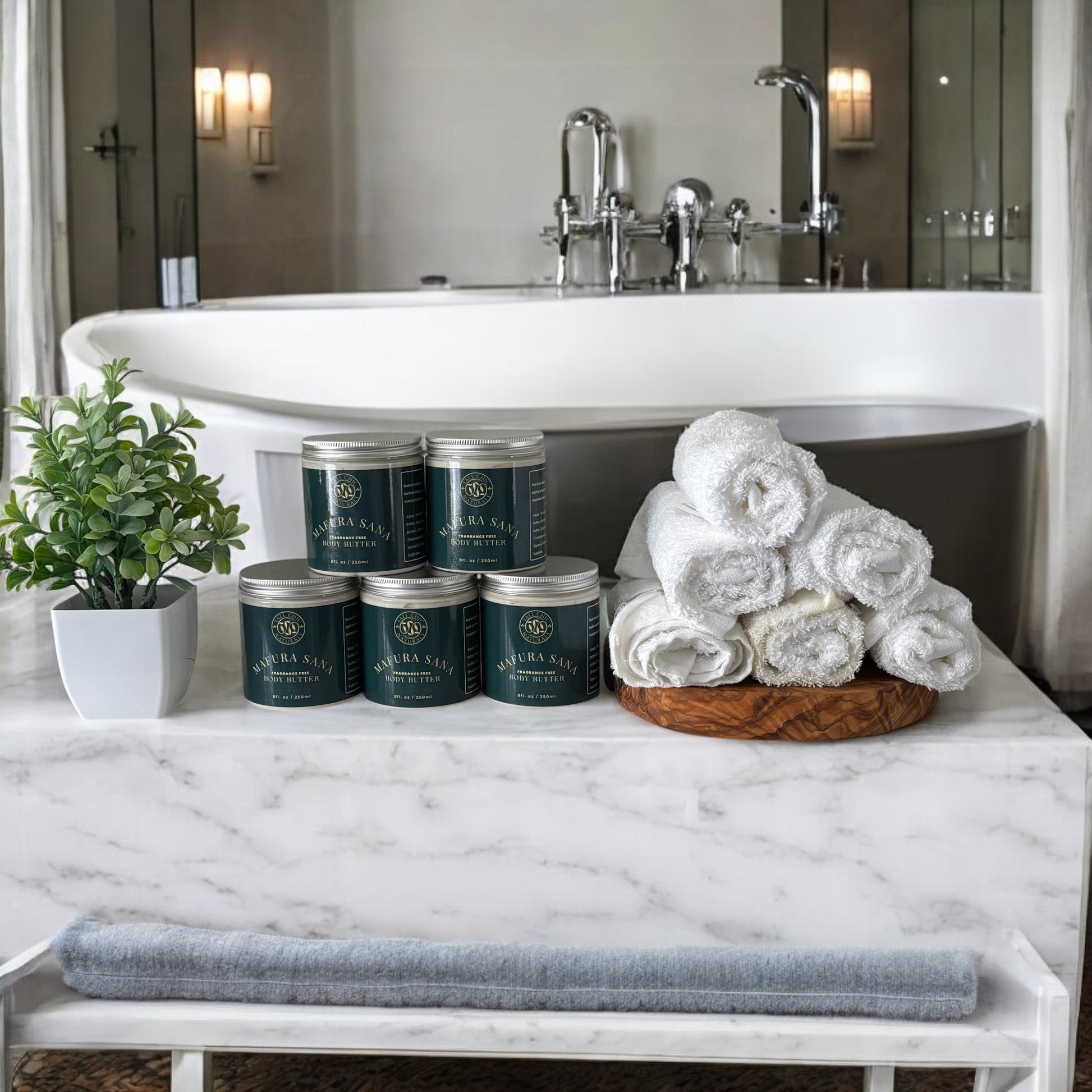 Tauchen Sie Ihre Haut in die reine, opulente Fülle der Mafura Sana Body Butter , einer luxuriösen Mischung, die die unvergleichliche Schönheit der Gaben der Natur feiert. Mit der Reinheit kaltgepresster Mafura-Butter im Herzen schmilzt dieser cremige Genuss mühelos in Ihre Haut und umhüllt sie mit tiefer, langanhaltender Feuchtigkeit.