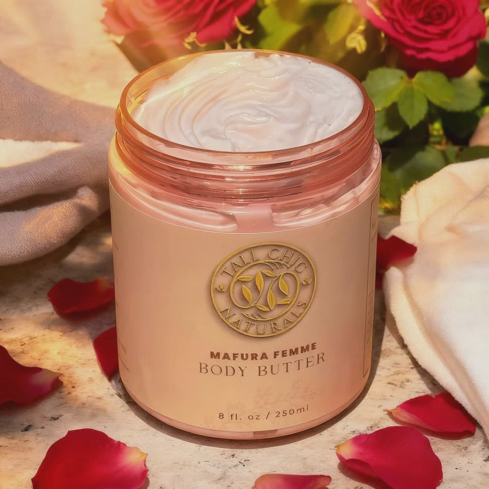 Indulge in the opulent richness of our body butter, graced with a lusciously creamy texture that effortlessly glides onto your skin, all courtesy of its star ingredient, Mafura butter. Abundant in essential fatty acids and Oleic acid, this natural marvel bestows upon your skin the fundamental building blocks it craves for robust cell membranes. Mafura Butter is your ultimate moisturizing solution, catering even to the thirstiest of skin types. Envelop yourself in the blends of the Rose, Lavender and Vanilla.