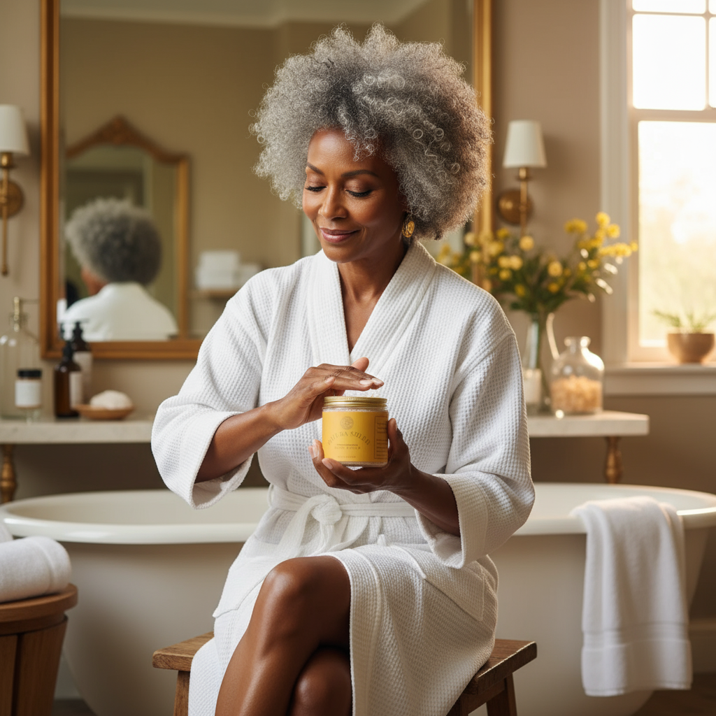 - Scoop a small amount and massage onto damp skin in circular motions, concentrating on rough areas like elbows, knees, and thighs.